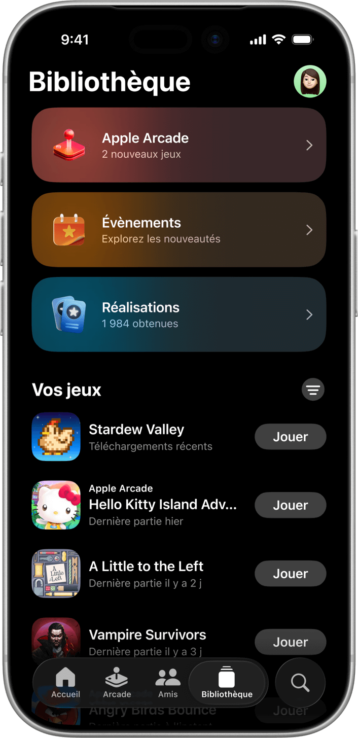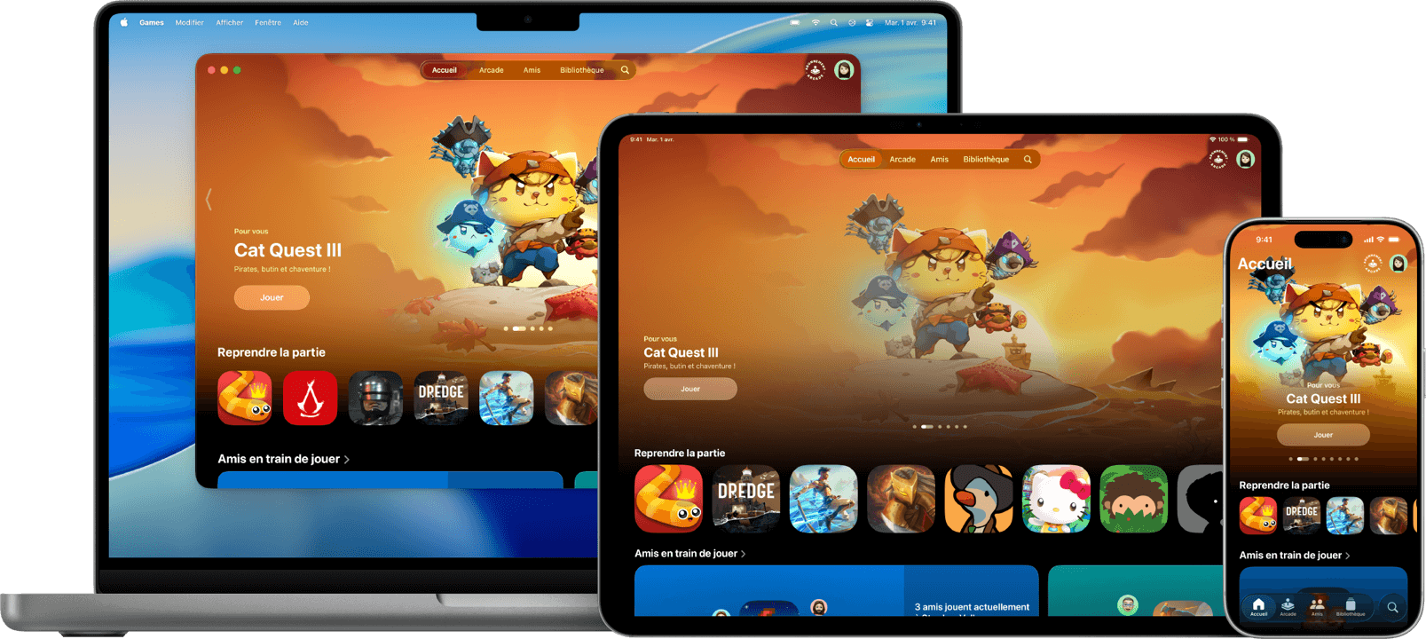 Profitez de centaines de jeux géniaux garantis sans publicité — d’Alto’s Odyssey - Remastered à Sneaky Sasquatch. Gardez le lien avec tous vos jeux Apple Arcade préférés et faites-en profiter vos proches avec une touche de compétition amicale5.